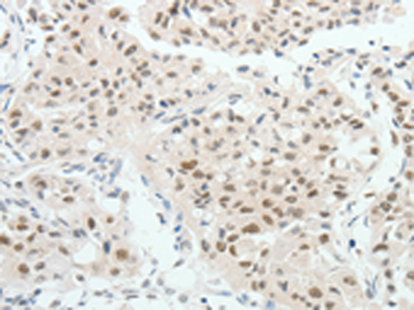 The image is immunohistochemistry of paraffin-embedded Human lung cancer tissue using P04219(HNF1B Antibody) at dilution 1/80. (Original magnification: ×200) |