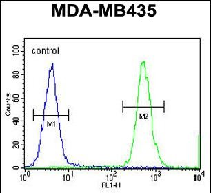 HNRNPCL1 Antibody (C-term) (Cat. #P30964) flow cytometric analysis of MDA-MB435 cells (right histogram) compared to a negative control cell (left histogram).FITC-conjugated goat-anti-rabbit secondary antibodies were used for the analysis. |