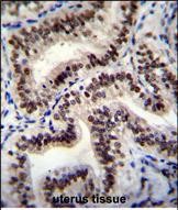 HNRNPCL1 Antibody (C-term) (Cat. #P30964)immunohistochemistry analysis in formalin fixed and paraffin embedded human uterus tissue followed by peroxidase conjugation of the secondary antibody and DAB staining.This data demonstrates the use of HNRNPCL1 Antibody (C-term) for immunohistochemistry. Clinical relevance has not been evaluated. |