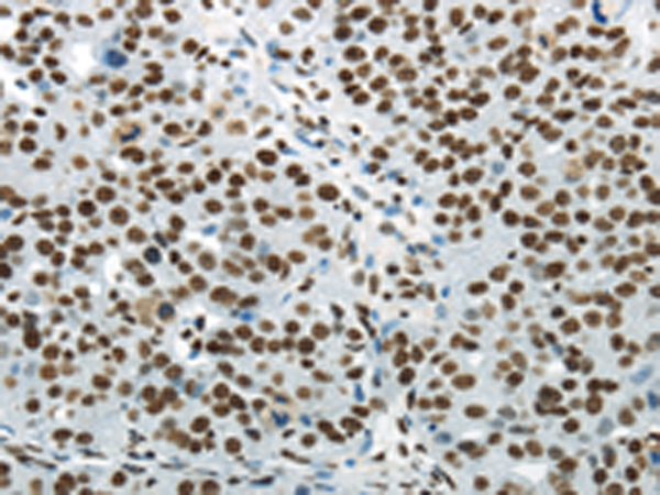 The image is immunohistochemistry of paraffin-embedded Human breast cancer tissue using P12407(HNRNPM Antibody) at dilution 1/25. (Original magnification: ×200) |