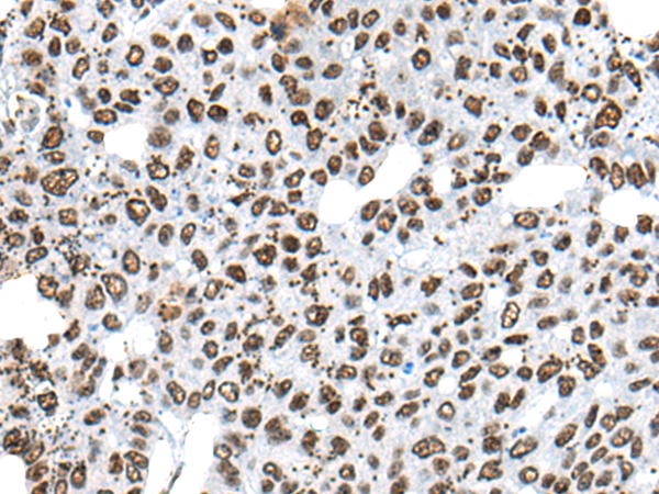 The image is immunohistochemistry of paraffin-embedded Human liver cancer tissue using P13159(HNRNPR Antibody) at dilution 1/20. (Original magnification: ×200) |