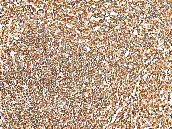 The image is immunohistochemistry of paraffin-embedded Human tonsil tissue using P13587(HNRNPUL1 Antibody) at dilution 1/20. (Original magnification: ×200) |