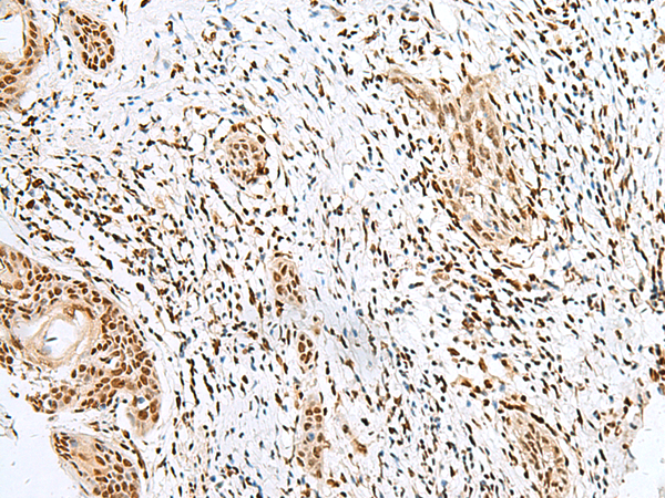 The image is immunohistochemistry of paraffin-embedded Human esophagus cancer tissue using P13587(HNRNPUL1 Antibody) at dilution 1/20. (Original magnification: ×200) |