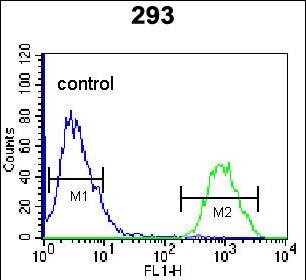 HOPX Antibody (C-term) (Cat. #P30962) flow cytometric analysis of 293 cells (right histogram) compared to a negative control cell (left histogram).FITC-conjugated goat-anti-rabbit secondary antibodies were used for the analysis. |