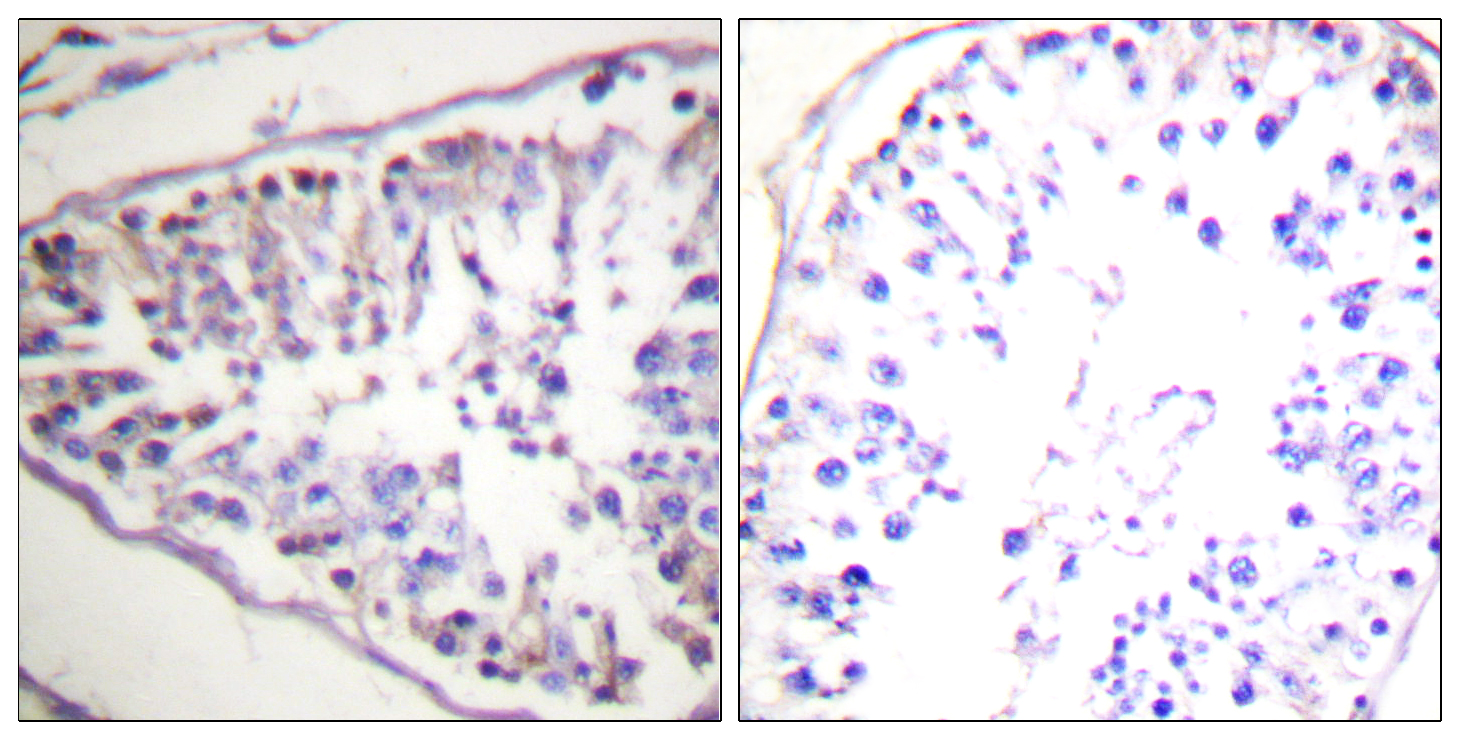 Immunohistochemistry analysis of paraffin-embedded Human tonsil tissue, using HSL antibody.High-pressure and temperature Sodium Citrate pH 6.0 was used for antigen retrieval. Sample with blocking peptide on the right. |