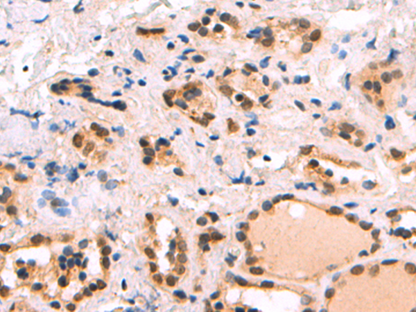 The image is immunohistochemistry of paraffin-embedded Human esophagus cancer tissue using P06905(HOXA1 Antibody) at dilution 1/50. (Original magnification: ×200) |
