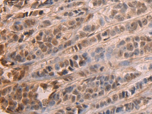 The image is immunohistochemistry of paraffin-embedded Human gastric cancer tissue using P13793(HOXA1 Antibody) at dilution 1/50. (Original magnification: ×200) |