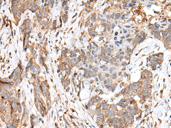 The image is immunohistochemistry of paraffin-embedded Human thyroid cancer tissue using P05791(HOXB6 Antibody) at dilution 1/20. (Original magnification: ×200) |