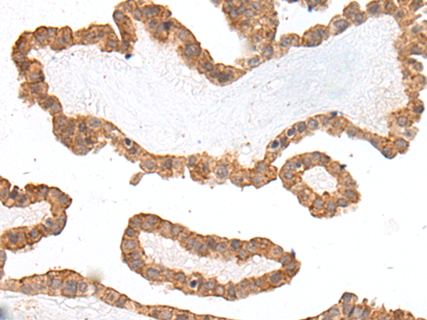 The image is immunohistochemistry of paraffin-embedded Human thyroid cancer tissue using P05835(HOXB7 Antibody) at dilution 1/25. (Original magnification: ×200) |
