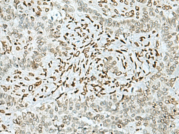The image is immunohistochemistry of paraffin-embedded Human ovarian cancer tissue using P13742(HOXC9 Antibody) at dilution 1/20. (Original magnification: ×200) |