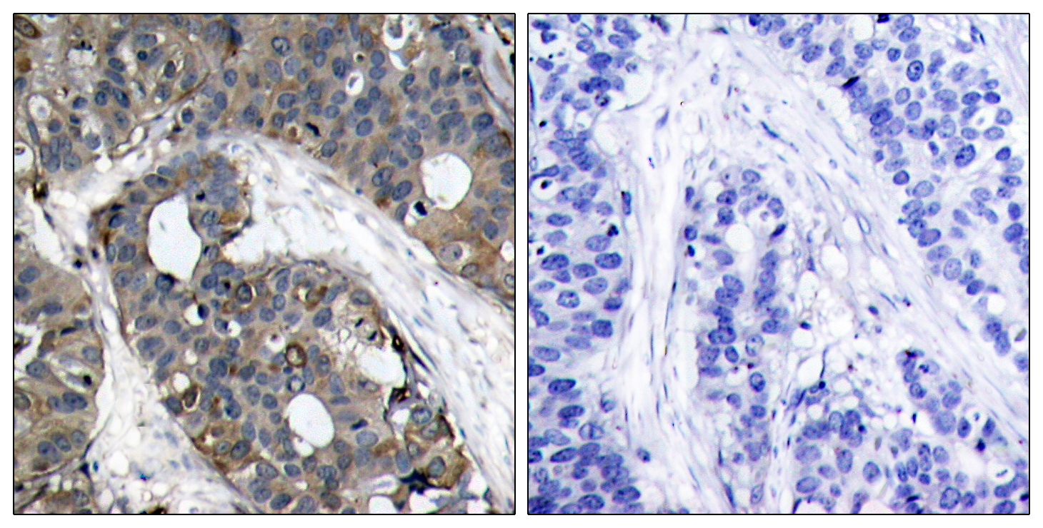 Immunohistochemistry analysis of paraffin-embedded Human breast carcinoma tissue using HSP27 (Ab82) antibody(left) or the same antibody. High-pressure and temperature Sodium Citrate pH 6.0 was used for antigen retrieval.Sample with blocking peptide on the right. |