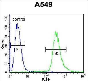 HSP90B1 Antibody (Center) (Cat. #P32784) flow cytometric analysis of A549 cells (right histogram) compared to a negative control cell (left histogram).FITC-conjugated goat-anti-rabbit secondary antibodies were used for the analysis. |