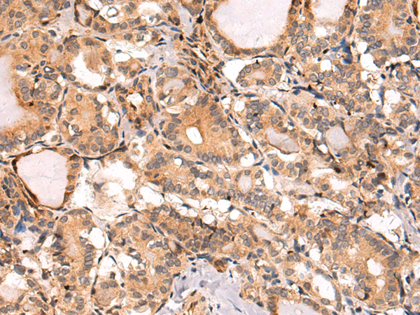 The image is immunohistochemistry of paraffin-embedded Human thyroid cancer tissue using P03535(HSPA13 Antibody) at dilution 1/100. (Original magnification: ×200) |