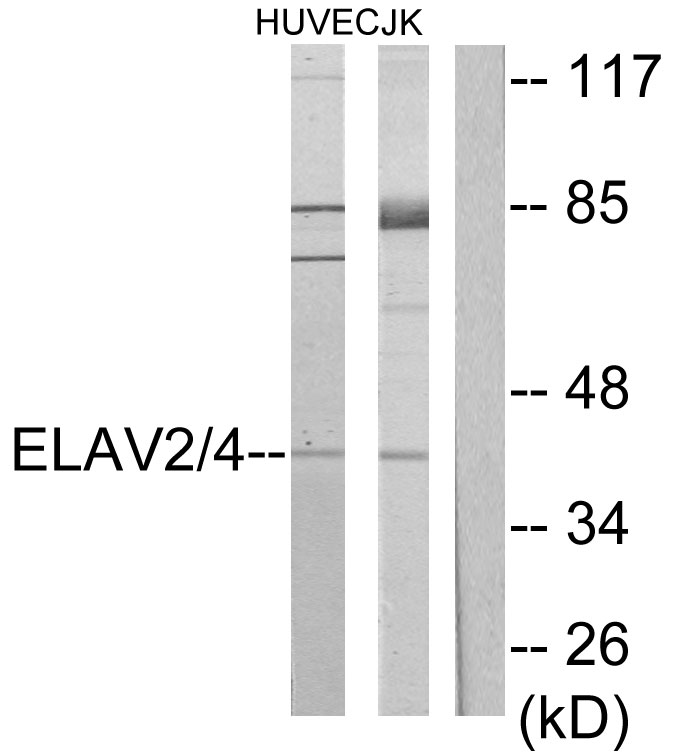Western blot analysis of HuB/HuD in Jurkat and HUVEC lysates using ELAV2/4 antibody. The lane on the right is blocked with the synthesized peptide. |