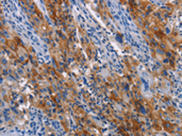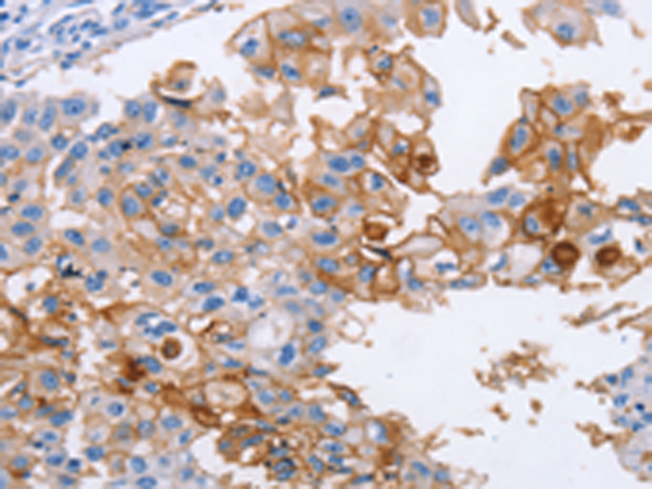 The image is immunohistochemistry of paraffin-embedded Human lung cancer tissue using P11645(ICAM1 Antibody) at dilution 1/40. (Original magnification: ×200) |