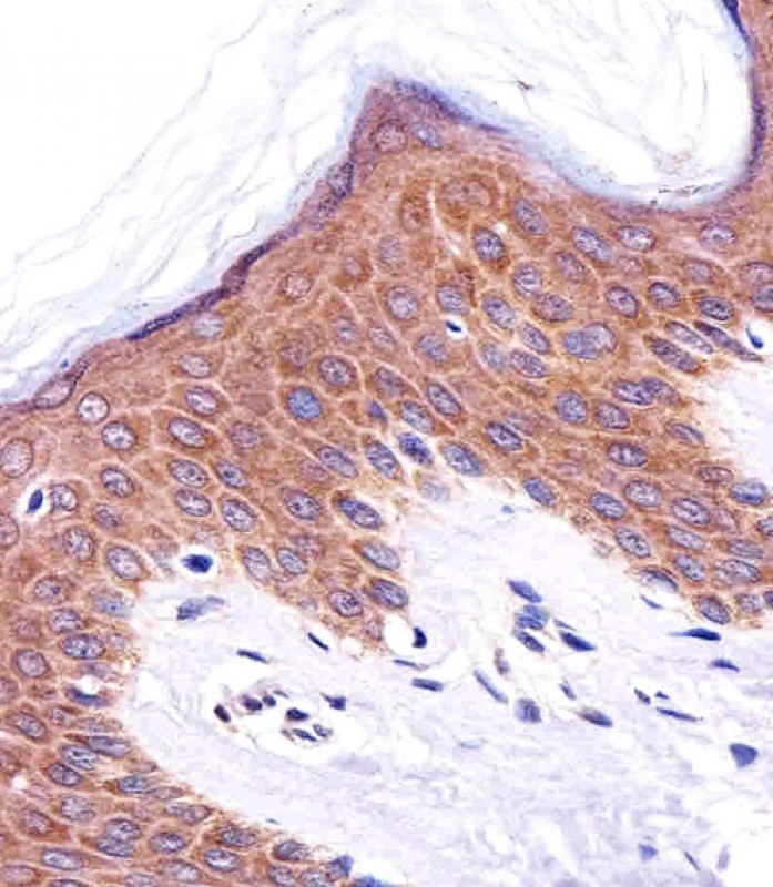 Immunohistochemical analysis of paraffin-embedded H. skin section using ICT1 Antibody (C-term)(Cat#P32478). P32478 was diluted at 1:25 dilution. A undiluted biotinylated goat polyvalent antibody was used as the secondary, followed by DAB staining. |