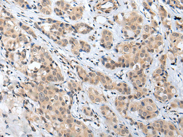 The image is immunohistochemistry of paraffin-embedded Human breast cancer tissue using P12683(IFI16 Antibody) at dilution 1/20. (Original magnification: ×200) |