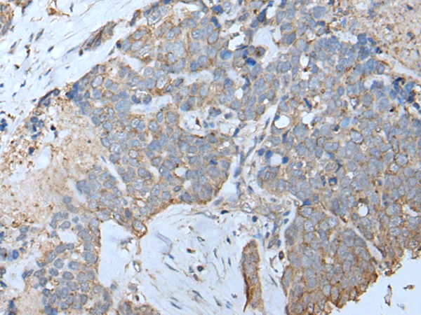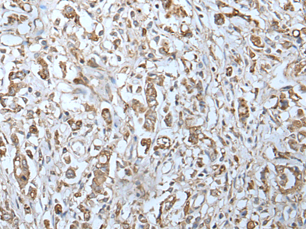 The image is immunohistochemistry of paraffin-embedded Human gastric cancer tissue using P05881(IFITM1 Antibody) at dilution 1/20. (Original magnification: ×200) |