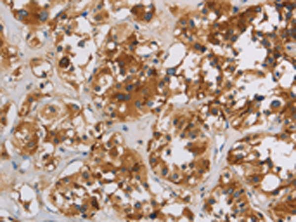 The image is immunohistochemistry of paraffin-embedded Human thyroid cancer tissue using P04956(IGF2R Antibody) at dilution 1/50. (Original magnification: ×200) |