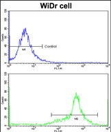 Flow cytometric analysis of widr cells using IGFBP6 Antibody (C-term)(bottom histogram) compared to a negative control cell (top histogram)FITC-conjugated goat-anti-rabbit secondary antibodies were used for the analysis. |