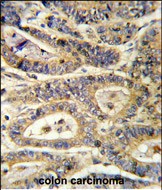 Formalin-fixed and paraffin-embedded human colon carcinoma reacted with IGFBP6 Antibody (C-term), which was peroxidase-conjugated to the secondary antibody, followed by DAB staining. This data demonstrates the use of this antibody for immunohistochemistry; clinical relevance has not been evaluated. |