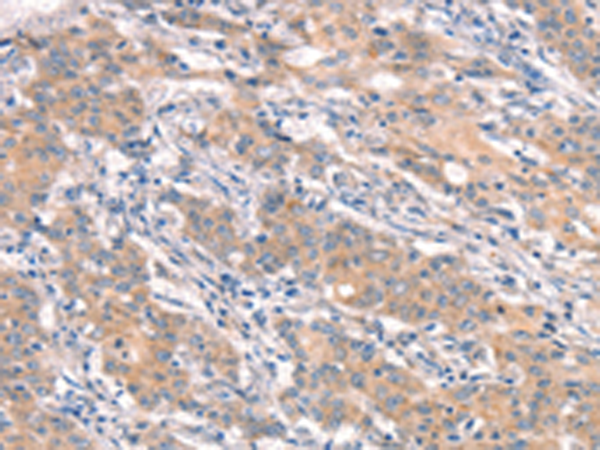 The image is immunohistochemistry of paraffin-embedded Human gastric cancer tissue using P11203(IKBKB Antibody) at dilution 1/25. (Original magnification: ×200) |