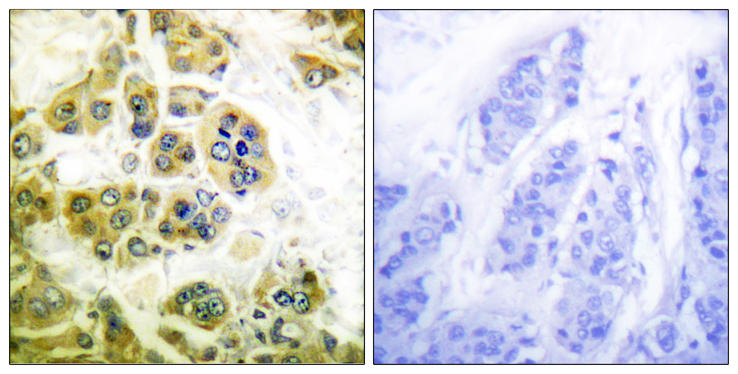 Immunohistochemistry analysis of paraffin-embedded Human breast carcinoma tissue, using IKKalpha/beta antibody.High-pressure and temperature Sodium Citrate pH 6.0 was used for antigen retrieval. Sample with blocking peptide on the right. |