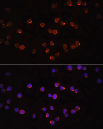 Immunofluorescence analysis of IL-1 beta in THP-1 cells using IL-1B antibody,and DAPI (blue). |