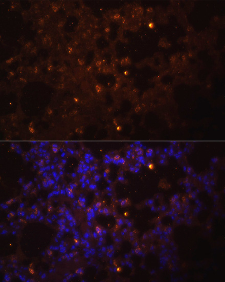Immunofluorescence analysis of IL-1 beta in mouse lung using IL-1B antibody,and DAPI (blue). |
