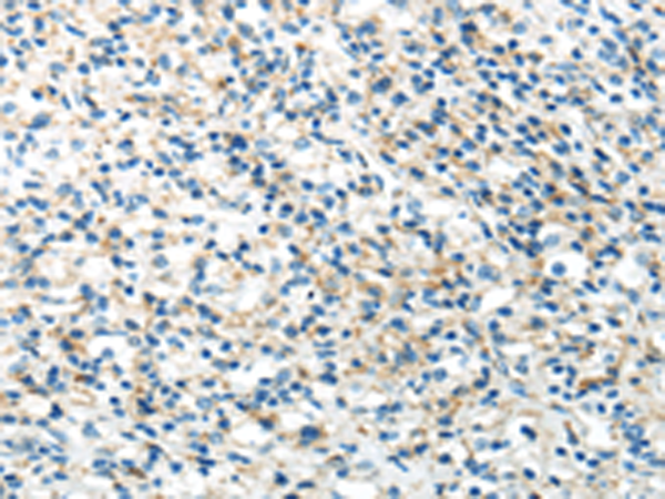 The image is immunohistochemistry of paraffin-embedded Human thyroid cancer tissue using P12409(IL12A Antibody) at dilution 1/20. (Original magnification: ×200) |
