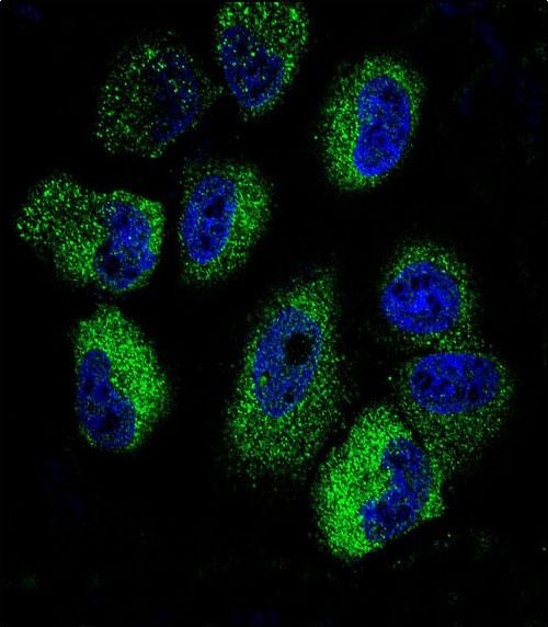 Confocal immunofluorescent analysis of IL13 Antibody (C-term) (Cat#AP7989b) with P31332 cell followed by Alexa Fluor 488-conjugated goat anti-rabbit lgG (green). DAPI was used to stain the cell nuclear (blue). |