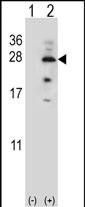 Western blot analysis of IL17B (arrow) using rabbit polyclonal IL17B Antibody (Center) (Cat. #P31026). 293 cell lysates (2 ug/lane) either nontransfected (Lane 1) or transiently transfected (Lane 2) with the IL17B gene. |