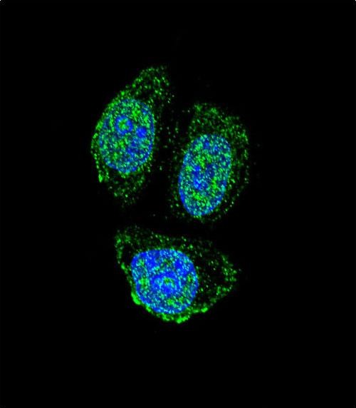 Confocal immunofluorescent analysis of IL17B Antibody (Center) (Cat#P31026) with Hela cell followed by Alexa Fluor 488-conjugated goat anti-rabbit lgG (green). DAPI was used to stain the cell nuclear (blue). |