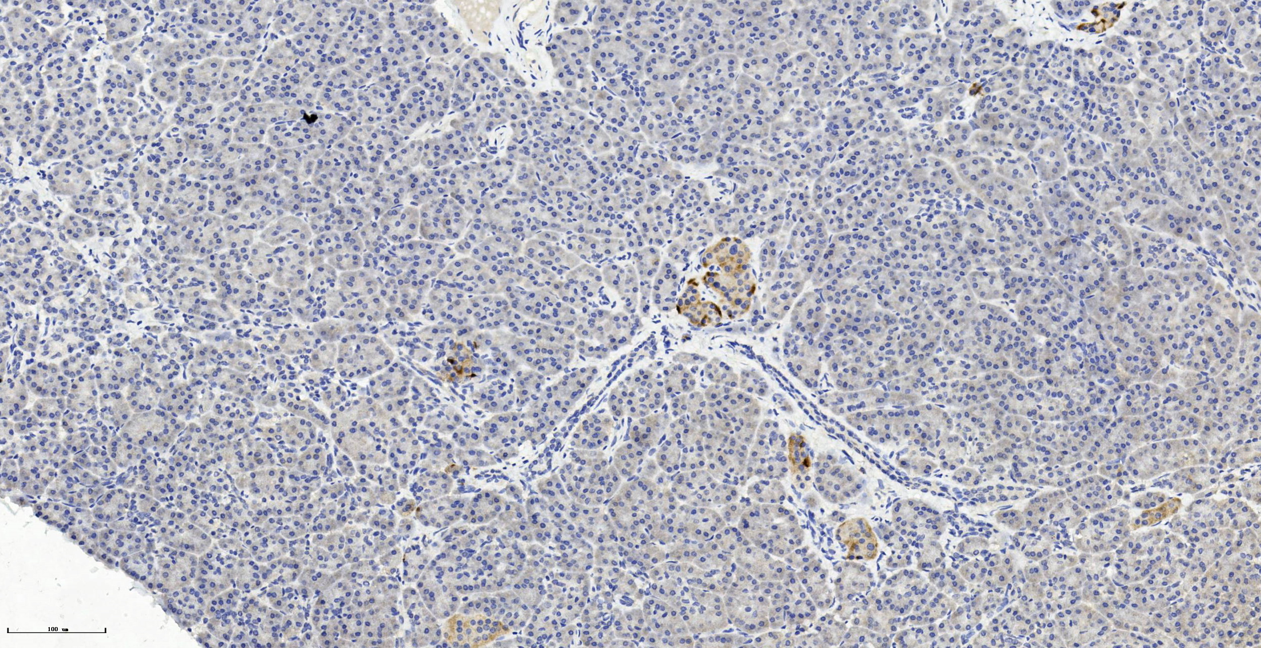 IL17B Antibody (Center) (Cat. #P31026)immunohistochemistry analysis in formalin fixed and paraffin embedded human pancreas tissue followed by peroxidase conjugation of the secondary antibody and DAB staining.This data demonstrates the use of IL17B Antibody (Center) for immunohistochemistry. Clinical relevance has not been evaluated. |