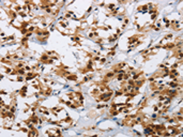 The image is immunohistochemistry of paraffin-embedded Human thyroid cancer tissue using P11845(IL17C Antibody) at dilution 1/50. (Original magnification: ×200) |