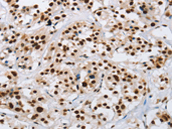 The image is immunohistochemistry of paraffin-embedded Human gasrtic cancer tissue using P04959(IL17C Antibody) at dilution 1/50. (Original magnification: ×200) |