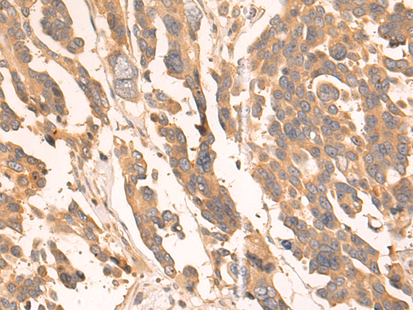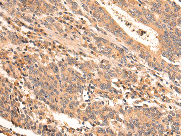 The image is immunohistochemistry of paraffin-embedded Human gastric cancer tissue using P07053(IL1RAP Antibody) at dilution 1/40. (Original magnification: ×200) |
