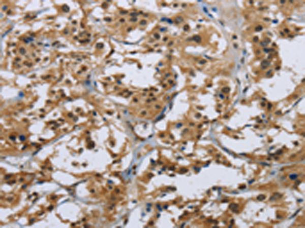 The image is immunohistochemistry of paraffin-embedded Human thyroid cancer tissue using P11850(IL31 Antibody) at dilution 1/20. (Original magnification: ×200) |