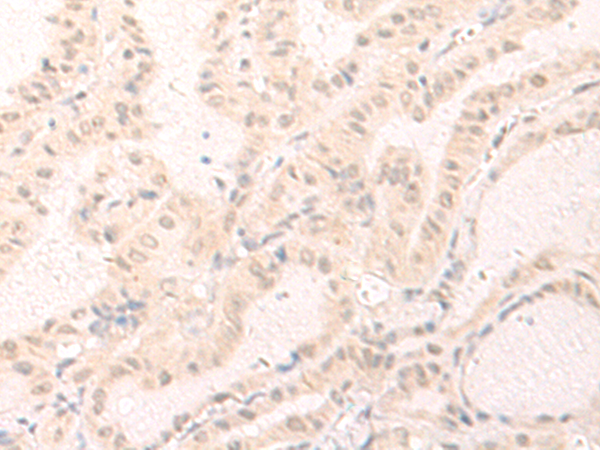 The image is immunohistochemistry of paraffin-embedded Human thyroid cancer tissue using P13335(IL7 Antibody) at dilution 1/30. (Original magnification: ×200) |