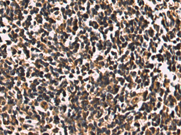 The image is immunohistochemistry of paraffin-embedded Human tonsil tissue using P06449(IL9 Antibody) at dilution 1/30. (Original magnification: ×200) |