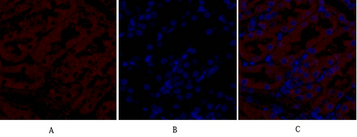 Immunofluorescence analysis of iNOS in iNOS in rat kidney using iNOS antibody(red). |