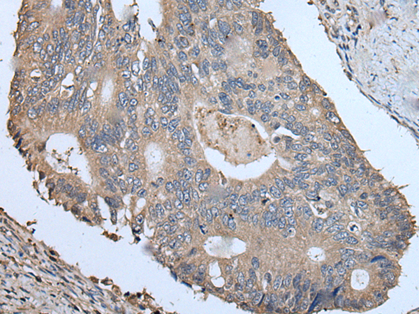 The image is immunohistochemistry of paraffin-embedded Human colorectal cancer tissue using P12759(IQGAP1 Antibody) at dilution 1/25. (Original magnification: ×200) |