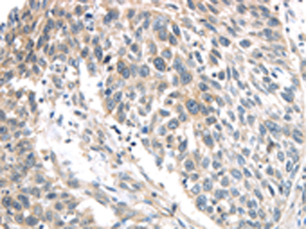 The image is immunohistochemistry of paraffin-embedded Human lung cancer tissue using P04049(IQGAP2 Antibody) at dilution 1/40. (Original magnification: ×200) |