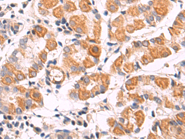 The image is immunohistochemistry of paraffin-embedded Human gastric cancer tissue using P05893(IRAK1 Antibody) at dilution 1/50. (Original magnification: ×200) |