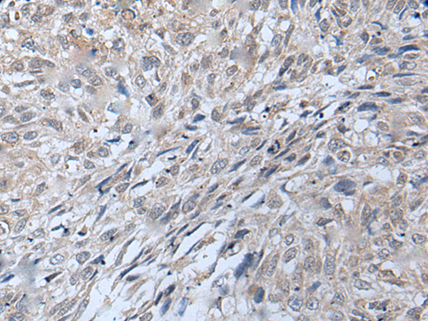 The image is immunohistochemistry of paraffin-embedded Human lung cancer tissue using P04051(IRF7 Antibody) at dilution 1/25. (Original magnification: ×200) |