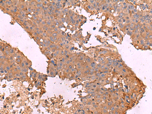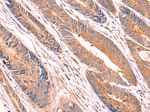 The image is immunohistochemistry of paraffin-embedded Human colorectal cancer tissue using P04975(ITGB7 Antibody) at dilution 1/40. (Original magnification: ×200) |