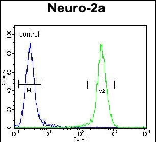 JOSD2 Antibody (N-term) (Cat. #P30812) flow cytometric analysis of Neuro-2a cells (right histogram) compared to a negative control cell (left histogram).FITC-conjugated goat-anti-rabbit secondary antibodies were used for the analysis. |