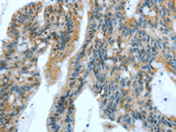 The image is immunohistochemistry of paraffin-embedded Human colon cancer tissue using P06984(JUN Antibody) at dilution 1/30. (Original magnification: ×200) |