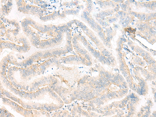 The image is immunohistochemistry of paraffin-embedded Human thyroid cancer tissue using P02781(KAT14 Antibody) at dilution 1/20. (Original magnification: ×200) |
