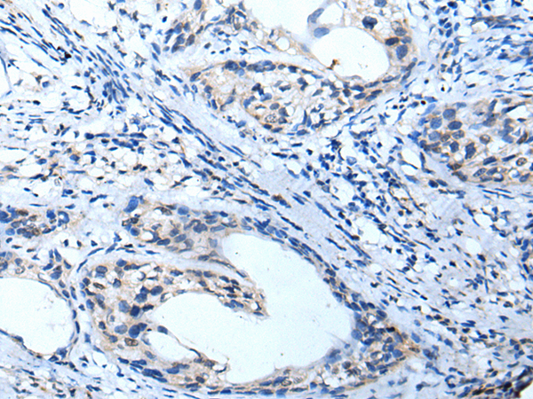 The image is immunohistochemistry of paraffin-embedded Human cervical cancer tissue using P05897(KCNA3 Antibody) at dilution 1/35. (Original magnification: ×200) |